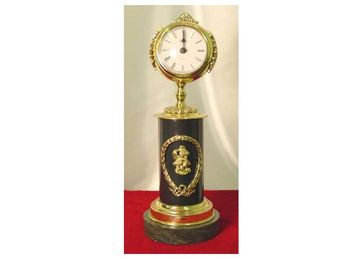 Часы «Подарочные» интересны формой корпуса, увенчанного пальметкой, расположенного на подставке в виде черного цилиндра, обрамленного шлифованной бронзой. В оформлении используется поделочный камень и накладки с разнообразной тематикой. Строгость и изысканность цветовой гаммы, современный дизайн в сочетании с благородным блеском бронзы или латуни, делает их неповторимым подарком. None