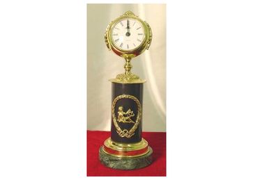 Часы «Подарочные» интересны формой корпуса, увенчанного пальметкой, расположенного на подставке в виде черного цилиндра, обрамленного шлифованной бронзой. В оформлении используется поделочный камень и накладки с разнообразной тематикой. Строгость и изысканность цветовой гаммы, современный дизайн в сочетании с благородным блеском бронзы или латуни, делает их неповторимым подарком. None