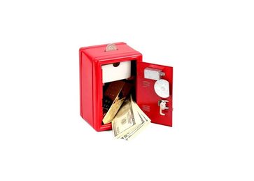 Металлическая копилка в виде сейфа с ключом и цифровым диском для ввода кода.
