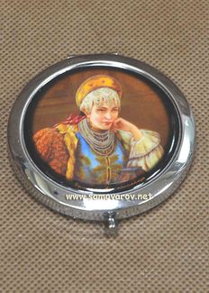 Косметическое складное зеркало - не только стильный аксессуар, но и практичный. Эскиз рисунка выполнен художником вручную, нанесение на поверхность - деколь.
