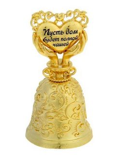 Сувенирный свадебный колокольчик с пожеланием молодоженам (884048) K010213 Эффектный свадебный колокольчик станет памятным свадебным подарком в день торжественного события. Аксессуар выполнен в золотистом оттенке, декорирован стилизованными изящными узорами с растительными элементами. Верхнюю часть сувенирного колокольчика образуют ладони, держащие сердце с фразой "Пусть дом будет полной чашей". Внутри подарочного аксессуара - круглая бусина на изящной цепочке. Миниатюрный свадебный подарок упакован в полупрозрачную красивую упаковку. Сувенирный подарок, приносящий процветание в семью, подарит радостные эмоции молодоженам. Размер: 5 х 10 см Материал: металл Мин. заказ 500 руб.