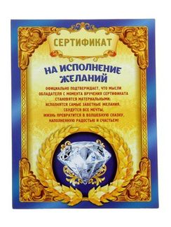 Свадебный магнит-сертификат на исполнение желаний (SL-898399) K010247 Замечательная идея для поднятия настроения! Свадебный магнит-сертификат на исполнение желаний приятно будет получить жениху и невесте в день бракосочетания, ведь обладатели такого свадебного атрибута смогут исполнить самые заветные свои желания, по крайней мере, так гарантируют его создатели. Выполнен он из бумаги, благодаря магниту может с легкостью крепиться на металлических поверхностях, имеет яркий и современный дизайн. Свадебный сертификат имеет мощную золотую рамку, которая смотрится стильно и дорого, сказочный текст написан красным шрифтом, а смысл этого текста понравится всем без исключения, в завершении, в виде украшения, изображен огромный кристалл в дуэте с золотыми украшениями. Свадебный магнит-сертификат можно приобрести не только на торжественную роспись, но и на празднование годовщины свадьбы. Размер: 10 х 13 см Материал: бумага, пластик Мин. заказ 500 руб.