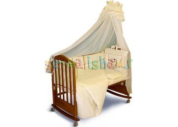 Комплект из 7 предметов: Бампер (раздельный на 4 стороны, высота 50см, синтепон, 120х60см), балдахин (вуаль, сатин, 170х300см), наволочка 40х60см, пододеяльник 110х140см, простыня 140х100см, одеяло (110х140см, шерсть 80%, ПЭ 20%), подушка (40х60см, шерсть 80%, ПЭ 20%). Ткань: сатин 100 % хлопок. Цвета: бежевый (шампань). None