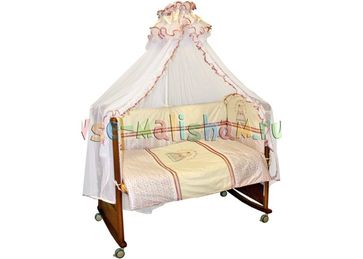 Комплект из 7 предметов: Бампер (раздельный на 4 стороны со съёмными чехлами, высота 50см, синтепон, 120х60см), балдахин (сетка, сатин, 180х500см), наволочка 40х60см, пододеяльник 110х140см, простыня 140х100см, одеяло (110х140см, шерсть 80%, ПЭ 20%), подушка (40х60см, шерсть 80%, ПЭ 20%). Ткань: сатин 100 % хлопок. Цвет: мелкие цветочки на молочном фоне None