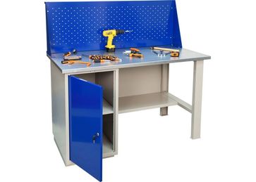 Однотумбовый комплект верстака состоит: Столешница изготовлена из МДФ толщиной 24мм. Покрыта оцинкованным листом металла 1,5 мм (Габариты: 1400x26х700 мм), распределённая нагрузка на столешницу 300 кг. Тумба: комплектуется 2-мя съемными регулируемыми полками (Габариты: 460х840х640 мм), нагрузка на полку 30 кг. Одна дверца, возможность смены стороны открывания двери, ключевой замок. Полка и стенка WSh-140/1+ опора WF-1 изготовлены из стали. Нагрузка на полку 40 кг. Дополнительно верстак можно укомплектовать перфорированным экраном и аксессуарами для инструментов.