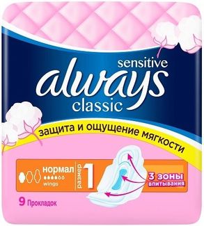 - Always Classic Normal Sensitive 9 прокладок в пачке по выгодной цене 167 р. руб.;
