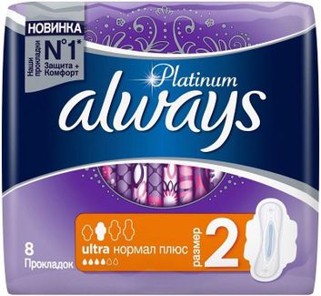 - Always Platinum Ultra Normal Plus 8 прокладок в пачке по выгодной цене 135 р. руб.;