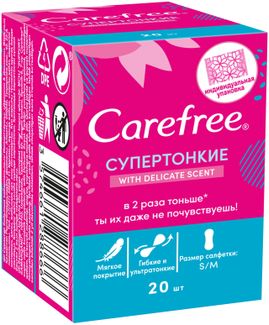 - Carefree with Delicate Scent 20 прокладок в пачке по выгодной цене 207 р. руб.;