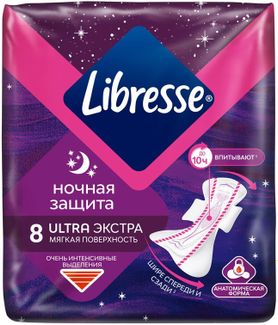 - Либресс Ultra Экстра Ночная Защита 8 прокладок в пачке по выгодной цене 225 р. руб.;
