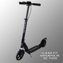 Clear Fit Megapolis SC 7000 Самокат для взрослых с ручным дисковым тормозом Технические характеристики: . Рекомендуемый возраст: от 10 лет . Высота руля: от 64 до 91 см (3 положения) . Ширина руля: 38 см . Материал корпуса: алюминий . Материал рукояток: резина . Общая длина: 93 см . Длина платформы: 33 см . Ширина платформы: 13,8 см . Колеса: полиуретан (83А) . Размер колес: 200 мм . Амортизаторы: передний, задний . Тормоз: задний наступающий, ручной . Подшипники: 4 шт ABEC 7 . Фиксатор поручня: да . Противоскользящее покрытие: да . Подножка: да . Клиренс: 5,5 см . Ремень для переноски: нет . Система складывания: да . Сертификаты международного качества: CE, GS, ISO 9001 . Цвет: черный . Артикул: cfsc_7000 . Гарантия: 1 год . Торговая марка: Франция . Страна изготовления: Китай . Максимальная нагрузка: 100 кг Размеры, вес и объем в упаковке: 85 х 15 х 35 см / 5 кг / 0,0446 мі Размеры (Д.Ш.В.): - в рабочем виде: 93 х 38 х 104 см - в сложенном виде: 85 х 16 х 32 см Вес: 4,5 кг Описание: Самокат для взрослых с ручным дисковым тормозом Clear Fit Megapolis SC 7000 представлен в максимальной комплектации, выполнен в стильном и лаконичном дизайне. Самокат рассчитан для взрослых, подростков и детей от 10 лет, стойка регулируется по высоте в 3-х положениях, от 64 до 91 см (высота от деки до поручня). Складная модель идеально подходит для перемещения по городу и для прогулок по парку. Удобный и безопасный механизм складывания позволяет легко сложить/разложить самокат одним нажатием - просто надавите ногой на фиксатор, опустите стойку, и рама автоматически заблокируется в сложенном положении. Для приведения самоката в рабочее состояние, также просто нажмите на фиксатор и поднимите стойку. Амортизация установлена на оба колеса, для максимального комфорта при преодолении небольших препятствий. Тормозная система состоит из классического ножного тормоза и дискового тормоза с ручным управлением. Колёса диаметром 200 мм, заднее колесо с рельефным протектором для быстрого и без
