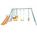 DFC MSGL-01 Детский комплекс с горкой Технические характеристики: . Для детей от 3 до 10 лет . Материалы: каркас - сталь, сиденье и горка - пластик . Пластмасса: устойчивая к воздействию солнечных лучей . Верхняя труба: 50,8 x 2 мм . Опора: 45 x 1,5 мм . Боковые трубки: 25,4 x 1,0 мм . Поручни и лестница: труба 25,4 х 1,0 мм . Порошковое покрытие металлических поверхностей . Регулируемые веревки для качелей . Артикул: MSGL-01 . Гарантия: 1 год . Торговая марка: Россия . Страна изготовления: Малайзия В комплекте: . Качели веревочные . Горка . Двухместные качели . Гондола Размеры и вес в упаковке: 178 х 40 х 28 см / 53 кг Размеры (Д.Ш.В.): 370 х 192 х 200 см Вес: 50 кг Описание: Уличный многофункциональный комплекс DFC MSGL-01 включает в себя: качели, горку, двухместные качели и гондолу. Игровой комплекс способен доставить удовольствие сразу нескольким детишкам, причем каждый из них может выбрать развлечение себе по вкусу это могут быть качели веревочные, гондола, горка или двухместные качели. Отлично подойдет для дачного участка или детской площадки во дворе дома. Идеально подходит для многодетных семей и для семей, которые любят собираться большими компаниями. На данной модели будет интересно заниматься детям от 3 до 10 лет! Компактная конструкция включает в себя А-образные металлические стойки и верхнюю трубу с креплениями для качелей. Для надежности А-образные трубы соединены боковыми трубками. Прочная стальная конструкция качелей с верхней трубой 50,8 х 2 миллиметра обеспечивает безопасность раскачивания. Сиденья и горка выполнены из экологически чистого пластика, устойчивого к воздействию солнечных лучей. Взрослые без труда могут отрегулировать качели по высоте так, как необходимо для удобства использования, все это можно сделать с помощью регулируемых веревок. Качели для двоих оборудованы подставкой для ног. Гондола для удобства оборудована спинками. Стойки опоры выполнены из стали с повышенной прочностью диаметром 45 миллиметров. Для обеспечения безопа