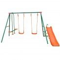 DFC MSN-01 Детский комплекс с горкой Технические характеристики: . Для детей от 3 до 10 лет . Материалы: каркас - сталь, спускной желоб и сиденье качелей - пластик . Пластмасса: устойчивая к воздействию солнечных лучей . Верхняя труба: 50,8 x 2 мм . Опора: 45 x 1,5 мм . Боковые трубки: 25,4 x 1,0 мм . Поручни и ступени лестницы: труба 25,4 х 1,0 мм . Литая конструкция спускного желоба обеспечивает надежную опору горки . Порошковое покрытие металлических поверхностей . Регулируемые по высоте веревки для качелей . Артикул: MSN-01 . Гарантия: 1 год . Торговая марка: Россия . Страна изготовления: Малайзия В комплекте: . Качели веревочные - 2 шт . Двухместные качели . Горка Размеры и вес в упаковке: 178 х 37 х 24 см / 40 кг Размеры спускного желоба (Д.Ш.В.): 177 х 36,5 х 24,5 см Размеры (Д.Ш.В.): 354 х 188 х 196 см Вес: 37 кг Описание: Детский игровой комплекс с горкой DFC MSN-01 для весёлого время препровождения на открытом воздухе состоит из 2 верёвочных качелей, двухместных качелей и горки. Отлично подойдет для установки на улице, в парке или на даче. Идеально подходит для многодетных семей и для семей, которые любят собираться большими компаниями. На данной модели будет интересно заниматься детям от 3 до 10 лет! Компактная конструкция включает в себя А-образные металлические стойки и верхнюю трубу с креплениями для качелей. Для надежности А-образные трубы соединены боковыми трубками. Прочная стальная конструкция качелей с верхней трубой 50,8 х 2 миллиметра обеспечивает безопасность раскачивания. Спускной желоб горки и сиденья выполнены из экологически чистого пластика, устойчивого к воздействию солнечных лучей. Крепление веревочного сиденья и его регулировка по высоте осуществляется изменением длины веревок. Двухместные качели оборудованы подставкой для ног. Стойки опоры выполнены из стали с повышенной прочностью диаметром 45 миллиметров. Для обеспечения безопасности на горке предусмотрена лестница и поручни. Литая конструкция спускного желоба обеспечивает на