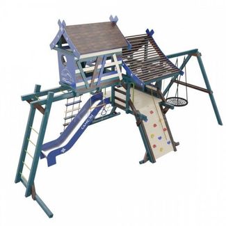 Внимание! Конструкция запатентована, сертифицирована по ГОСТ . Детские игровые деревянные площадки для дачи серии Хижина предназначены для детей от 4 до 12 лет, и создают условия, обеспечивающие физическое развитие ребенка, развивающие координацию движений, преодоление страха высоты, ловкость и смелость, чувство коллективизма в массовых играх. Материал: Каркас изделия изготовлен из клеенного бруса лиственницы, ограждение и иные элементы из массива сосны. Покрытие: 3 слоя защитного покрытия! 1 слой - грунт 2 слой - акриловый лак на водной основе 3 слой - акриловый лак на водной основе Детали, которые подвержены абразивному воздействию (обувь, песок и т.п.), настил пола, ступени и скалодром, покрыты маслом, что позволяет легко обновлять поверхность. Достаточно удалить пыль и грязь, обработать маслом на водной основе, и они снова будут иметь прекрасный вид. Комплектация: крыша деревянная с ярким пластиковым декором; мансарда с пластиковой панелью и окном; кольца-трапеция; скалодром-сетка; широкий скалодром с разноцветными пластиковыми зацепками; канатная лестница "ванты"; качели-гнездо (диаметром 0,6м), качели из гибкого пластика; рукоход деревянный с металлическими перекладинами; горка из единого листа нержавеющей стали с пластиковыми бортами. Габариты площадки: внешние размеры 7,7м х 3,5м; высота 4,2м; длина горки 2,8м. Общий вес площадки: 875 кг (+-5кг) Описание: Товар поставляется в разобранном виде. В комплект для самостоятельной сборки входит подробная инструкция по сборке товара. Товар упакован в гофрокартонные короба в количестве: 32 места. Установка детской игровой площадки проводится на ровной поверхности, свободной от насаждений. Размер площадки не менее 5,5м х 9,5м (предварительно). Рекомендуем зафиксировать конструкцию используя анкера любой формы. Гарантия: 1 год, подробнее об условиях гарантии здесь . Производство: России, компания Самсон. Усовершенствуйте Вашу игровую площадку! Наши менеджеры помогут Вам сделать выбор дополнительного спортивного и игр