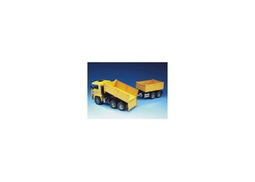 Самый настоящий грузовик-самосвал с прицепом для юных техников и строителей от 3х лет. Эта машина – копия реальной техники в масштабе 1:16. Ребенок играет и радуется – катает машину по полу, открывает и закрывает бортики, переворачивает кузов и т.д., использует для сюжетно-ролевых игр: обыгрывая погрузку, перевозку и разгрузку. Крайне важно качественное исполнение игрушки (прочность, устойчивость, грузоподъёмность, функциональность и т.д.) – соответствует европейским нормам безопасности для игрушек и американским потребительским стандартам, производится только в Германии. Игровые функции: кабина машины откидывается - доступ к двигателю произвден; зеркала на стойках складываются; колёса выполнены из мягкого пластика - не гремят при езде и не царапают пол; задний и боковые борта кузова грузовика и прицепа откидываются, а потом обратно закрываются и защёлкиваются; кузов (и грузовика и прицепа) поднимается для разгрузки на 45 градусов, одновременно откидывается задний борт (если он отщёлкнут). В поднятом состоянии фиксируется стойкой. Для того чтобы опустить кузов, его надо немного приподнять и стойка складывается сама – теперь кузов можно опускать; прицеп при помощи жёсткой сцепки и фаркопа надёжно прикрепляется к грузовику, не соскакивая при движении. Прицеп можно отсоединить, на креплении жёсткой сцепки есть небольшой рычажок, при повороте которого опускается стойка-упор – теперь прицеп очень устойчив и не перевернётся под тяжестью груза. None