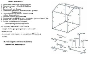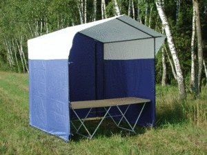 Вес: 13 кг. Размеры: 1.5 х 1.5 м, длина козырька 30 см. Особенности: в задней стенке имеется дверь на молнии.Инструкция к торговой палатке 1,5х1,5 м None