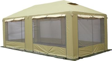 В этом шатре площадью 18 кв. м. комфортно разместится 20 человек. Беседка предназначена для коллективного отдыха на природе и может использоваться в виде летней кухни. Тент пошит из полиэфирной ткани с водоотталкивающей пропиткой, устойчивой к воздействию солнечных лучей. Швы крыши проклеены. Широкая замкнутая юбка полностью исключает поддув холодного воздуха снаружи, затекания воды, проникновение змей, грызунов и пр.. В верхней части крыши встроен вентиляционный закрывающийся изнутри клапан, снабженный антимоскитной сеткой от насекомых и защитным козырьком от осадков. В двух противоположных боковых стенах имеются окна из прозрачной пленки, закрывающиеся шторками на молниях. Тент крепится к каркасу при помощи стропы с пряжкой и липучек. Это позволяет осуществить хорошую натяжку тента, что очень важно при ветре и дожде. Все стенки с москитной сеткой и шторками сверху пришиты к тенту и крепятся к ножкам при помощи застежек-молний. При необходимости все стенки могут подниматься. Тент имеет 12 прочных петель-оттяжек для повышения ветроустойчивости. Каркас беседки изготовлен из стальной трубы Ø 25 и 28 мм, имеет нижнее основание и покрыт порошковой краской. Нижнее основание и верхняя обвязка служат для повышения прочности конструкции. Для фиксации элементов каркаса между собой используются кнопки-защёлки. Соединительные элементы (крестовины) выполнены из стальной трубы увеличенной толщины. В комплект шатра входит: — каркас; — крыша с ножками; — сплошные стенки (2 шт.); — стенки с окнами (4 шт.) — стенки из антимоскитной сетки (6 шт.). Вы можете купить пол в этот шатер: для шатра размером 33 м Вам понадобится 1 штука, а вот для шатра 36 м Вам нужно будет купить 2 штуки этого пола. Также не забудьте купить комплект колышков, чтобы хорошо растянуть Ваш шатер и сделать его еще более крепким и ветроустойчивым. Инструкция к тенту садовому Митек Пикник 3х6 м, Пикник Люкс 3х6 м, Элит 3х6 м, Беседка 3х6 м. None