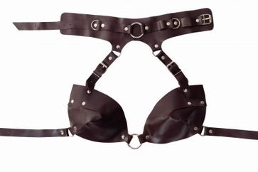 Роскошная сбруя выполнена из натуральной кожи. Высокий ошейник с металлическим кольцом спереди присоединяется к изысканному кожаному лифу. Сбруя фиксируется ремнями и пряжками, позволяющими подобрать нужный размер. Размер универсальный. Страстный аксессуар станет отличным дополнением к БДСМ-игре. Ширина ошейника - 5,5 см.<br> Ширина ремешков - 2 см.<br> Обхват - 31-42 см. None
