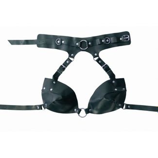 Роскошная сбруя выполнена из натуральной кожи. Высокий ошейник с металлическим кольцом спереди присоединяется к изысканному кожаному лифу. Сбруя фиксируется ремнями и пряжками, позволяющими подобрать нужный размер. Страстный аксессуар станет отличным дополнением к БДСМ-игре. Ширина ошейника - 5,5 см.<br> Ширина ремешков - 2 см.<br> Обхват - 31-42 см. None