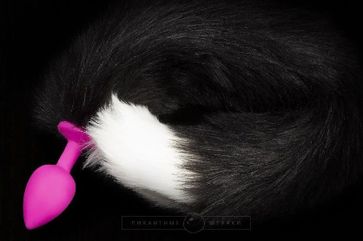 Розовая силиконовая анальная пробка с черным хвостиком (184548)