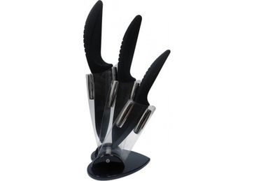 Набор из 3-х керамических ножей выполненных из черной циркониевой керамики на подставке. Рукоять ножей выполнена из прорезиненного, приятного на ощюпь и противоскользящего пластика. Идеально гладкая поверхность керамического лезвия превращает нарезку продуктов в одно удовольствие. None Возможен самовывоз. Есть доставка. Доставка: 161.0RUR