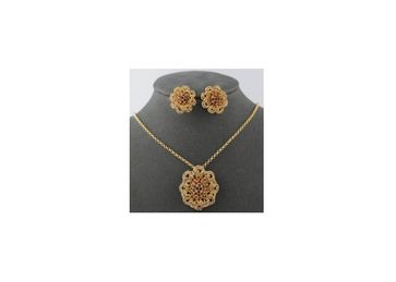 Комплект бижутерии кулон на цепи 45 см, серьги застежка гвоздик . Кулон размером 3.5 2.5 см, серьги 2.2 2.2 см. Желтый металл, вставка сердцевина фианиты цвет коричневый, огранка круглая, лепестки фианиты цвета шампань, огранка круглая. Подвеска и серьги выполнены в форме цветка, где сердцевинка переливается гранатовым блеском, а воздушные лепестки играют алмазными гранями. Привлечь внимание просто, если вы выбрали комплект Гранатовый цвет . Прекрасное дополнение к любому костюму! None Можно купить без предварительного заказа. Возможен самовывоз. Есть доставка.