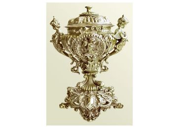 Современная работа, выполненная в стиле барокко. Тулово на ножке, расширяющееся кверху, покрыто крышкой, украшено картушами и вставками, цветы и листва, чередуясь друг с другом, являют запутаннейшую картину. По бокам – амуры, выполняющие функцию ручек. None