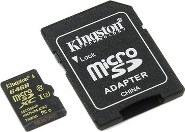 - Карта памяти Kingston SDCG 64GB microSDXC Memory Card 64Gb UHS-I U3 + microSD--SD Adapter по выгодной цене 2 521 р. руб.;