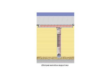 Горизонтальная часть водостока – желоб, может быть подвесным или составлять элемент конструкции свеса кровли, так называемый водоотбойник. Кабель укладывается «дорожкой» в несколько параллельных линий в подвесной желоб или вдоль водоотбойника. Для «холодной крыши» и подвесных желобов диаметром 100 – 120 мм обычно достаточно двух линий кабеля общей погонной мощностью 40 – 50 Вт/м. При больших диаметрах желоба количество линий возрастает до 4 – 5. Для «теплой крыши» общая погонная мощность возрастает до 80 – 100 Вт/м.