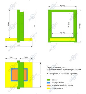 Передаточный узел состоит из каркаса, остекления, передаточного лотка и прилавка. Каркас кассового окна выполнен из стали, окрашенной порошковой эмалью. Остекление - защитный стеклоблок (антивандальное либо взломостойкое стекло). Прилавок изготовлен из ламинированной пластиком ДСП. Передаточное устройство, глубиной 38 мм, шириной 215 мм, рассчитано под передачу листов формата А4. Минимальные возможные размеры передаточного узла (по проёму в перегородке): высота 400 мм, ширина 400 мм. Максимальные размеры: высота 2500 мм, ширина 2500 мм. Передаточный узел поставляется полностью собранным, что значительно упрощает его установку.