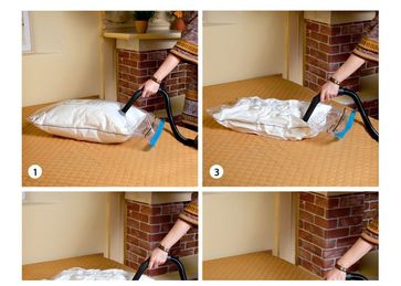 Способ применения: Положите вещи в пакет и плотно загерметизируйте его с помощью надёжной застёжки. Затем с помощью обычного пылесосного шланга выкачайте воздух из пакета. Не рекомендуется хранить вещи в вакуумном пакете дольше полугода.