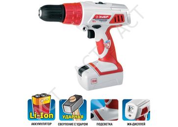 - Дрель-шуруповерт ЗУБР 2-х скор.,Li-Ion,реверс,16+1,функция удара,БЗУ, 10мм, 0-350 и 0-1200об мин,1.3А ч, 18В,кейс с акс. по выгодной цене 4 390 р. руб.;
