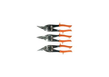 Ножницы по металлу с двухрычажной системой для облегчения реза. Набор содержит ножницы для реза листового металла трех типов: 1 – прямого проходного правого реза, 2 – прямого проходного левого реза, 3 – прямого реза. None