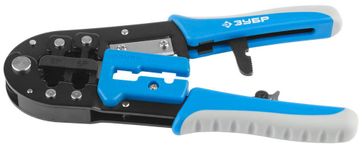 Кримпер ЗУБР "ЭКСПЕРТ" универсальный, "DATA-КОННЕКТ", со встроенным кабелерезом, съемником изоляции и ограничителем