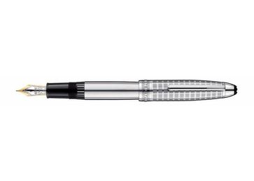 Артикул - 9938 Перьевая ручка с поршневым механизмом заправки; перо из 18-каратного золота, украшенное вставкой с родиевым напылением, корпус и колпачок из нержавеющей стали, колпачок украшен графической лазерной гравировкой и инкрустированной эмблемой Montblanc, клип с платиновым напылением, кольца из нержавеющей стали