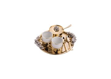 Кофейный дуэт «Ты и я» - оригинальный свадебный подарок молодоженам, ставшим одним целым, единым, дуэтом... Продукция компании Chinelli отличается стилем, в котором традиции и классика сочетаются с современным дизайном, искусно сливаясь в единое целое. Новая дизайнерская линия декорирована позолотой, в основе элементов декора фарфора лежит искусство плетения XVIII века... Особенностью новой линии из чёрного стекла и хрусталя, отличающейся тончайшей проработкой каждого элемента, декорированной кристаллами Swarovski, является сильное эстетическое воздействие. Она словно дает импульс воображению тех, кто любит необычные акценты. Плавные линии, оригинальные рисунки, изящная отделка и формы непревзойденной красоты превращают каждый предмет коллекции в идеальное украшение любого вашего дня. Габариты: поднос D20x2 чашка D5x6 сахарница D7x4 см; Материал: фарфор, металл, золочение,Вес 750гр Внимание! Подарок поставляется на заказ 3-4 рабочих дня! None