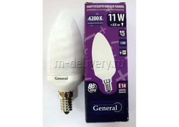 - Энергосберегающая лампа General Е-14 11W (заменяет 55W) 4200K cвеча по выгодной цене 185 р. руб.;