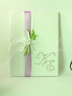 Папка для свидетельства GilliannCarly PSV031 Папка Carly сделана из светло-зеленого атласа, украшена сиреневой полосой с цветком. Буквы, нанесенные стразами - К и Е символизируют имена молодоженов. Стильная папка с красивым декором подойдет для летней свадьбы, особенно, если церемония проходит на природе. Зеленоватые тона будут идеально сочетаться с окружающей природой - пышной растительностью, благоухающими цветами, порхающими бабочками. Материалы и декор: атлас, атласные ленты, декоративные элементы, стразы. None
