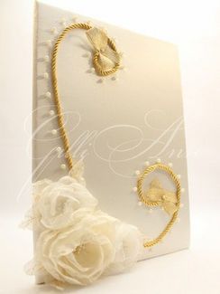 Папка для свидетельства Gilliann Golden Time PSV026 Папка - один из предметов коллекции Golden Time. Сделана из атласа цвета айвори, перекрученный золотистый шнурок-тесьма образует два завитка, каждый из которых окружен россыпью небольших жемчужин. На конце завитков - маленькие бантики из органзы с жемчужиной. В нижнем углу обложки - роскошное соцветие белой розы, украшенное вышивкой, жемчугом, бусинами. Материалы и декор: атлас, органза, декоративные элементы, жемчуг, бусины. None