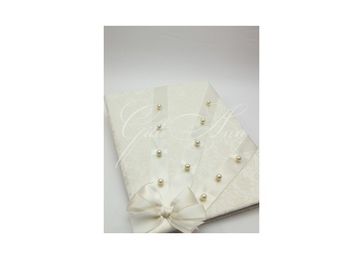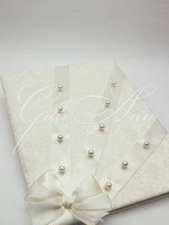 Папка для свидетельства Gilliann Ivory Charm PSV046 Папка из коллекции Ivory Charm сделана из атласа цвета айвори, сверху обтянута прозрачным кружевом. Атласные ленты образуют интересную композицию, расходясь от банта в три радиальные полосы. На каждой полосе в строгой последовательности закреплены жемчужины. Материалы и декор: атлас, атласные ленты, кружево, жемчуг. None