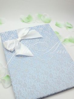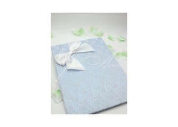 Папка для свидетельства Gilliann Lace Tenderness PSV048 Папка Lace Tenderness сделана из голубого атласа, сплошь обтянутого белым кружевом с мелким рисунком. Такой дизайнерский прием зрительно создает эффект тисненой рельефной поверхности. Декор дополняет бант из белых атласных лент в верхнем углу обложки. Материалы и декор: атлас, атласные ленты, кружево. None