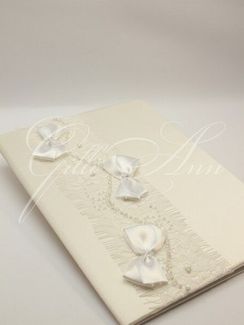 Папка для свидетельства Gilliann Shantel Crystal PSV018 Папка для свидетельства - часть коллекции Shantel Crystal. Выполнена из атласа цвета айвори, отделана широкой полосой прозрачного кружева с бахромой по волнистым краям. По кружеву рассыпались жемчужины и бусины, вдоль волнистой змейки - три бантика из белого атласа с жемчужинами. Торжественная, праздничная папка, прекрасно подойдет для классической официальной церемонии. Материалы и декор: атлас, атласные ленты, кружево, жемчуг, бусины. None