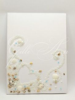 Папка для свидетельства о браке Gilliann Ocean Pearl PSV052 Красивая свадебная папка ручной работы, оформленная в морском стиле. Обложка обтянута белоснежным атласом и украшена прекрасной композицией, напоминающей дно океана. Мельчайший перламутровый бисер имитирует коралловые рифы, которые образуют красивые завитки и сердце. Обложка декорирована натуральными ракушками разных видов, крупными бусинами-жемчужинами и полупрозрачными голубыми бусинками. Морской декор создает романтичную атмосферу и навевает приятные воспоминания об отдыхе, поэтому папка Gilliann Ocean Pearl будет прекрасно гармонировать как с морской, так и с классической свадьбой, задавая правильный тон торжеству. Внутри папки расположен прозрачный файл, в который вставляется свидетельство о заключении брака. Материалы и декор: атлас, бисер, бусины, ракушки. None