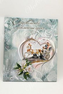 Папка для свидетельства о заключении брака, серебро ST1436 Элегантная папка для свидетельства о браке, выполненная в зимнем стиле. Серебристо-серая обложка словно покрыта хрупкими морозными узорами белого цвета. В центре обложки изображено большое сердце, которое снизу украшено композицией из цветов, а сверху парой белых влюбленных голубей. В центре сердца изображена статуэтка в виде молодоженов в серебристой повозке с белой лошадью в упряжке. Красивыми буквами выполнена надпись "Свидетельство о заключении брака". Размер: 26 х 22 см Мин. заказ 500 руб.