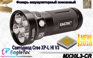 Мощнейший поисковый аккумуляторный фонарь EagleTac MX30L3-CR с холодным белым светом, на "дальнобойных" светодиодах Cree XL-L Hi V3!