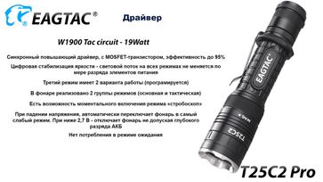 Как и другие фонари ЕагТак, оружейный фонарь EagleTac T25C2 Pro, рассчитан на огромные нагрузки, сверх-надежен, долговечен и обладает высоким КПД. Как и предшественник, он работает и от батарей CR123A, и от аккумуляторов 18650, к нему подходит удлинитель корпуса фонаря EagTac G25C2 на 18650. Но в отличие от предшественника ЕаглеТак
