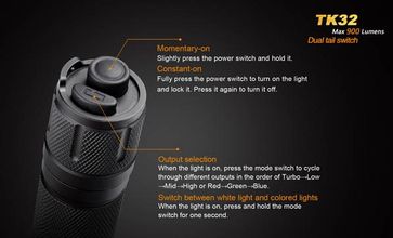 Благодаря углубленному и широкому параболическому отражателю поисковый фонарь Fenix TK32 превращает энергию от 1-го аккумулятора 18650 в световой поток 900 люмен способный отправить луч на дистанцию до 400 метров! Это стало возможным по причине использования передового светодиода CREE XM-L2 U2. Этот продукт компании Fenixligh, так же, располагает возможностью подсвечивать красным, зеленым и синим светом благодаря интегрированному RGB светодиоду. Но одновременно светить белым и цветными светодиодами фонарь Fenix TK32 не может. Выбор всех режимов (в том числе и цветного света) осуществляется 2-мя клавишами в торце.