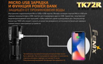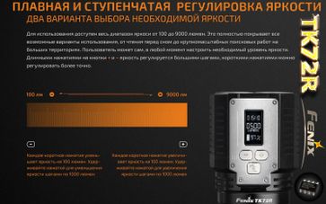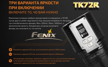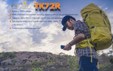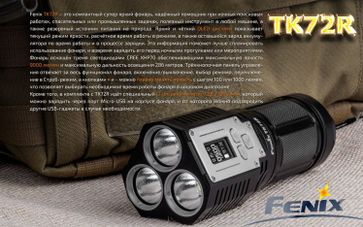 Светодиодный поисковый фонарь TK72R, позиционируется как универсальный источник света, для эксплуатации в городе и на природе, с яркостью до 9 000 люмен и дальностью до 286 метров, компании FenixLight. Плавная регулировка яркости и сигнал строб удовлетворяют различным потребностям, включая дезориентацию противника в экстренной ситуаций. Интеллектуальная схема цифровой защиты от перегрева автоматически снизит яркость для уменьшения температуры и сохранения светодиодов, а после снижения температуры вернёт турбо-режим. Умная электроника стабилизирует питание обеспечивая равномерный свет не зависимо от заряда аккумулятора и дает возможность изделию работать в различных режимах яркости. Продукт на удивление компактен, имея длину всего 156 мм и головную часть корпуса 59 мм, что достаточно удобно для переноски. Герметичный разъем аккумуляторного фонаря служит для подключения питания микроUSB и снабжен внутренней защитой от проникновения воды, то есть, даже без заглушек он сохраняет водонепроницаемость в рамках спецификаций IP68. Это удобно, так как не нужно брать с собой в поездку отдельно зарядное устройство. А выходной порт USB позволяет подзарядить мобильные устройства от фонаря, используя его как Повер-Банк. Питание Fenix TK72R