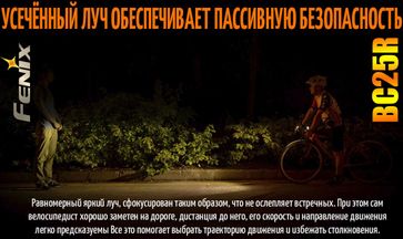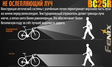 Велофара Fenix BC25R. Важной особенностью, этого фонаря для велосипедных прогулок по городу и ночным паркам, является особая оптическая система с распределением света на ближнюю и дальнюю зоны. Верхняя часть засветки этого изделия отсекается, оберегая глаза встречных участников движения, по этому Феникс ВС25R не ослепляет пешеходов.