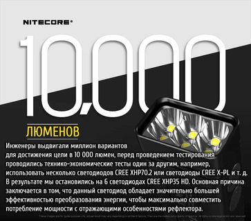 Новинка 2018 года — Фонарь аккумуляторный NiteCoreTM10K на светодиодах Cree XHP35 HD, яркость до 10000 люмен, это поисковый фонарик с зарядкой USB Тип C , продолжающий популярную линейку НайтКор Tiny Monster, с увеличенной яркостью. None