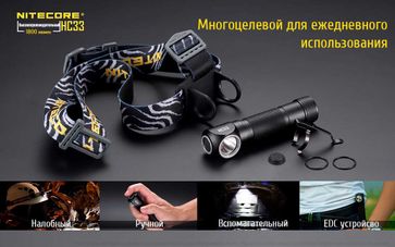 Новинка 2017 года — Фонарь универсальный, налобный NiteCoreHC33 на светодиоде Cree XHP35 HD, яркость 1800 люмен, это фонарик с аккумулятором, усовершенствующий популярную модель НайтКор HC30.